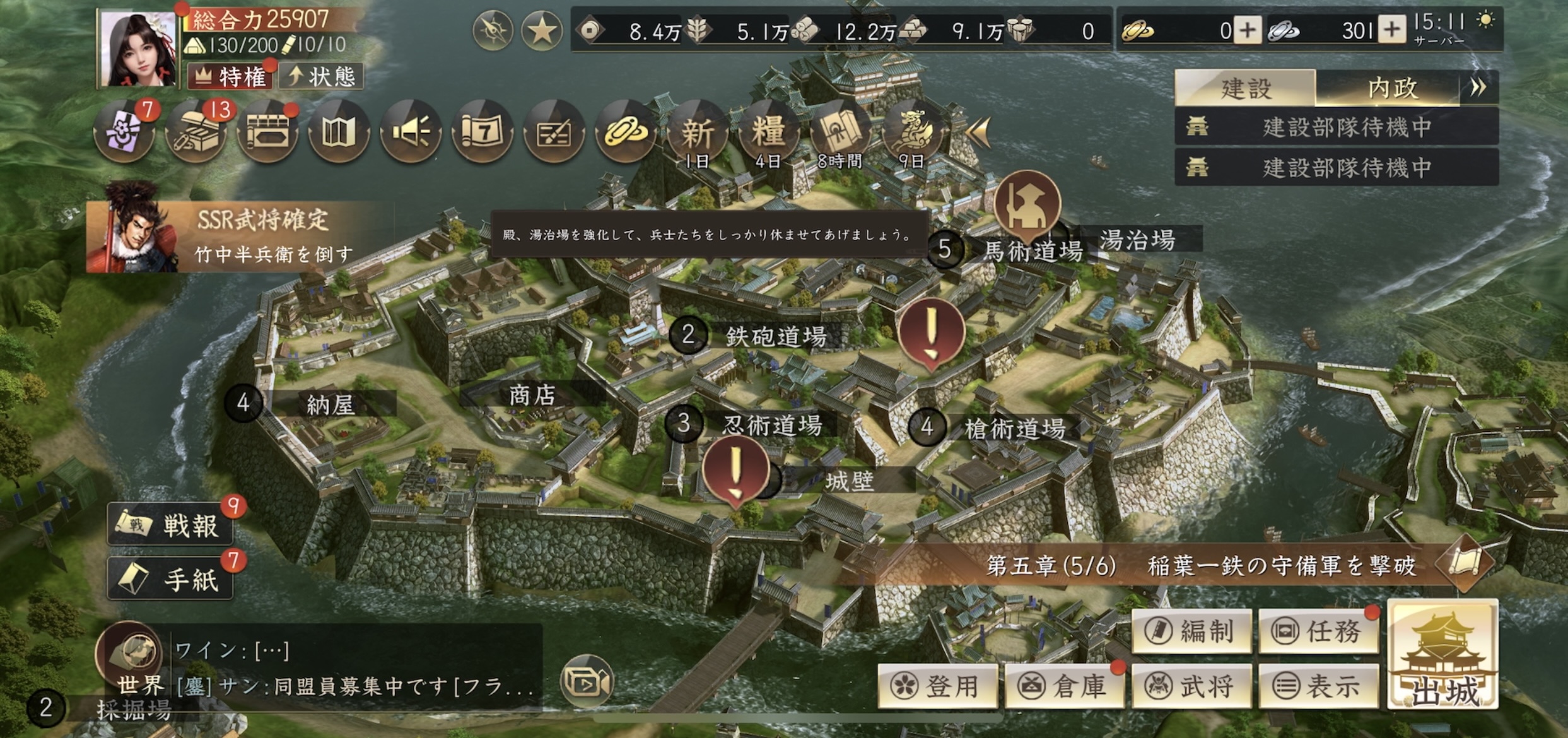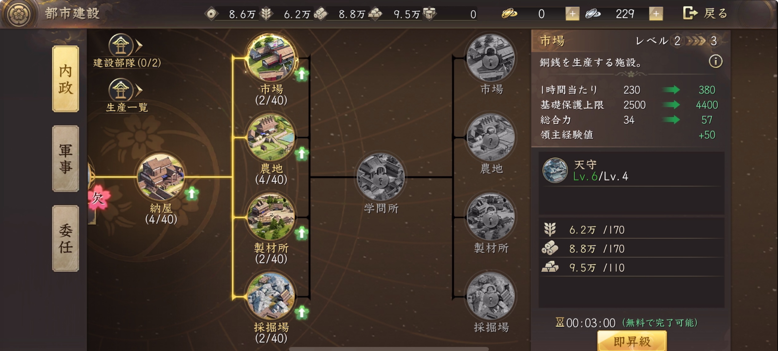 特に大事なのは田んぼ(食料)、伐採場(木材)、採石場(石材)といった資源系の施設。ここを育てておくと建物や兵士の強化に必要な素材が安定して集まっていくよ!!!